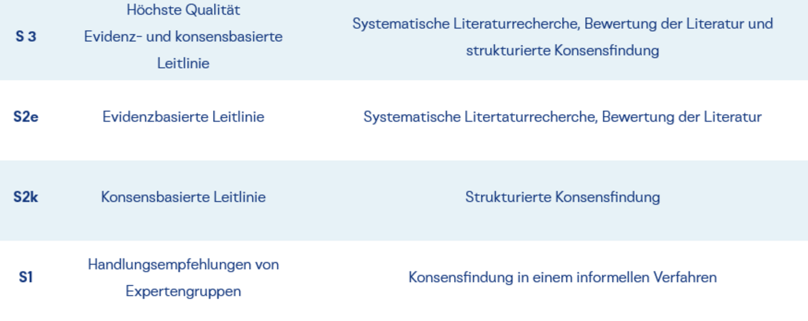 Leitlinien werden in verschiedene Niveaus eingeteilt, welche die Systematik der Erstellung aufzeigen. Die Tabelle beschreibt das Stufenmodell.